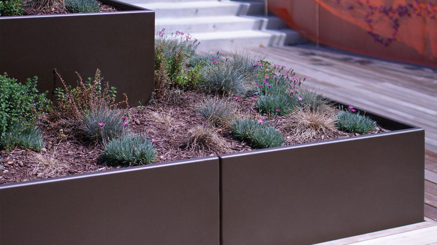 All custom metal planters are manufactured from marine grade 5054 aluminum, typically with 1/8" walls, reinforced as necessary with rims and ribs that keep the shape intact. The powder coating helps to protect from the elements, and silicone 'feet' raise the planters slightly to provide drainage access for water.