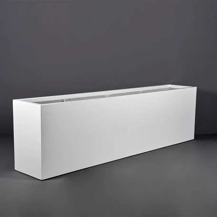 A long rectangular planter crafted out of top-quality fiberglass material, the Hudson pot is exceptionally strong, durable and safe enough for either indoor or outdoor use. The size alone of this trough planter makes it the preferred choice for commercial properties, storefronts, garden landscapes and large foyers. Combine multiple rectangle planters to create a live border around your outdoor terrace, use them to add a bit more privacy to your patio or line them up to separate indoor seating areas. You can also place a box or two along the wall of your garden, position them in the window of your kitchen or arrange them along your front corridor.